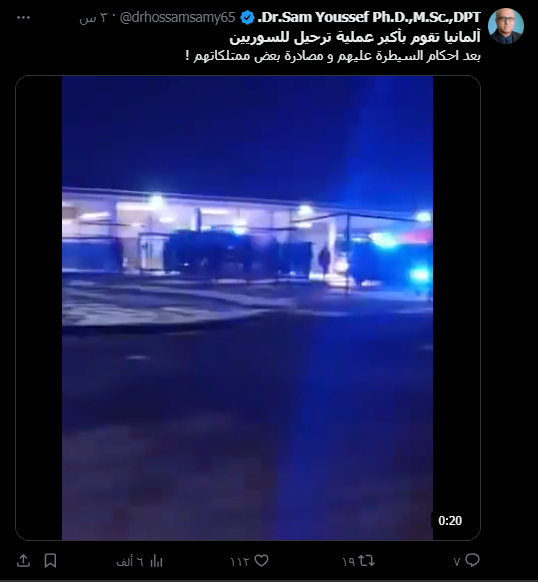 ادعت حسابات على منصة إكس تسجيل مصور يظهر سيارات فرق الاطفاء والبوليس الألماني في أحد كامبات اللجوء، قالوا أنها لعملية ترحيل لاجئين سوريين.