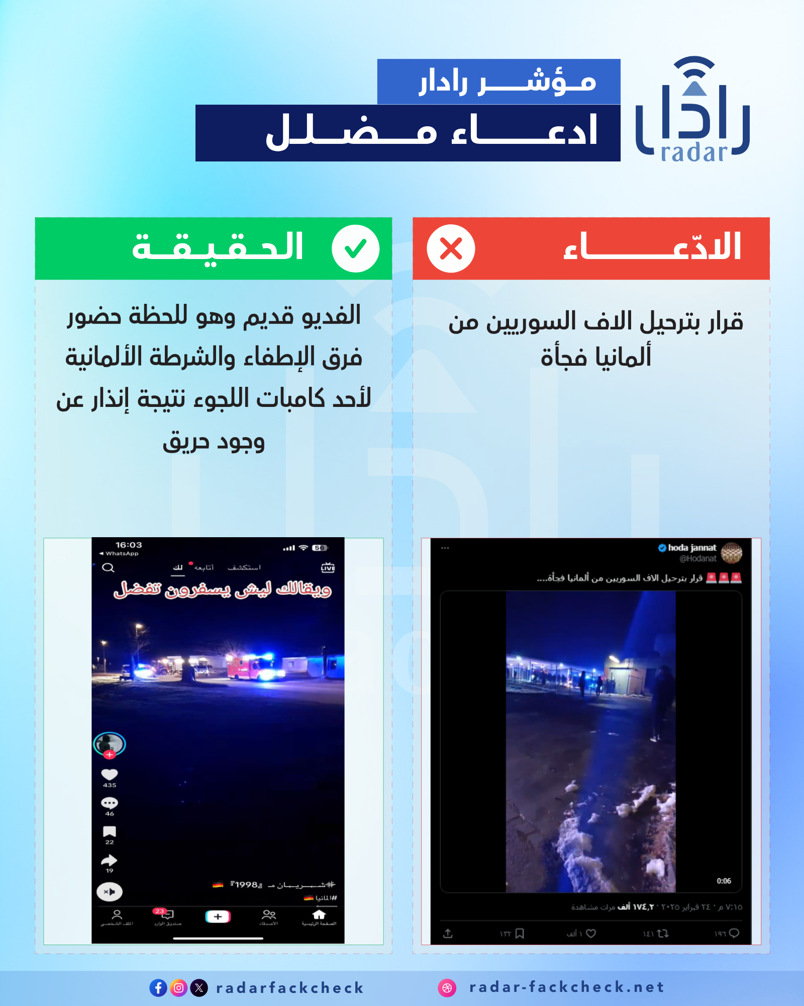 أجرى فريق منصة رادار تحقيقاً عن صحة الفيديو وخبر ترحيل اللاجئين السوريين من ألمانيا، ووجد أن الفيديو المتداول قديم وهو للحظة حضور فرق الإطفاء والشرطة الألمانية لأحد كامبات اللجوء نتيجة إنذار عن وجود حريق، كما أن الصحف والمصادر الرسمية الألمانية لم تذكر أي معلومات أو أخبار بخصوص ترحيل لاجئين سوريين.