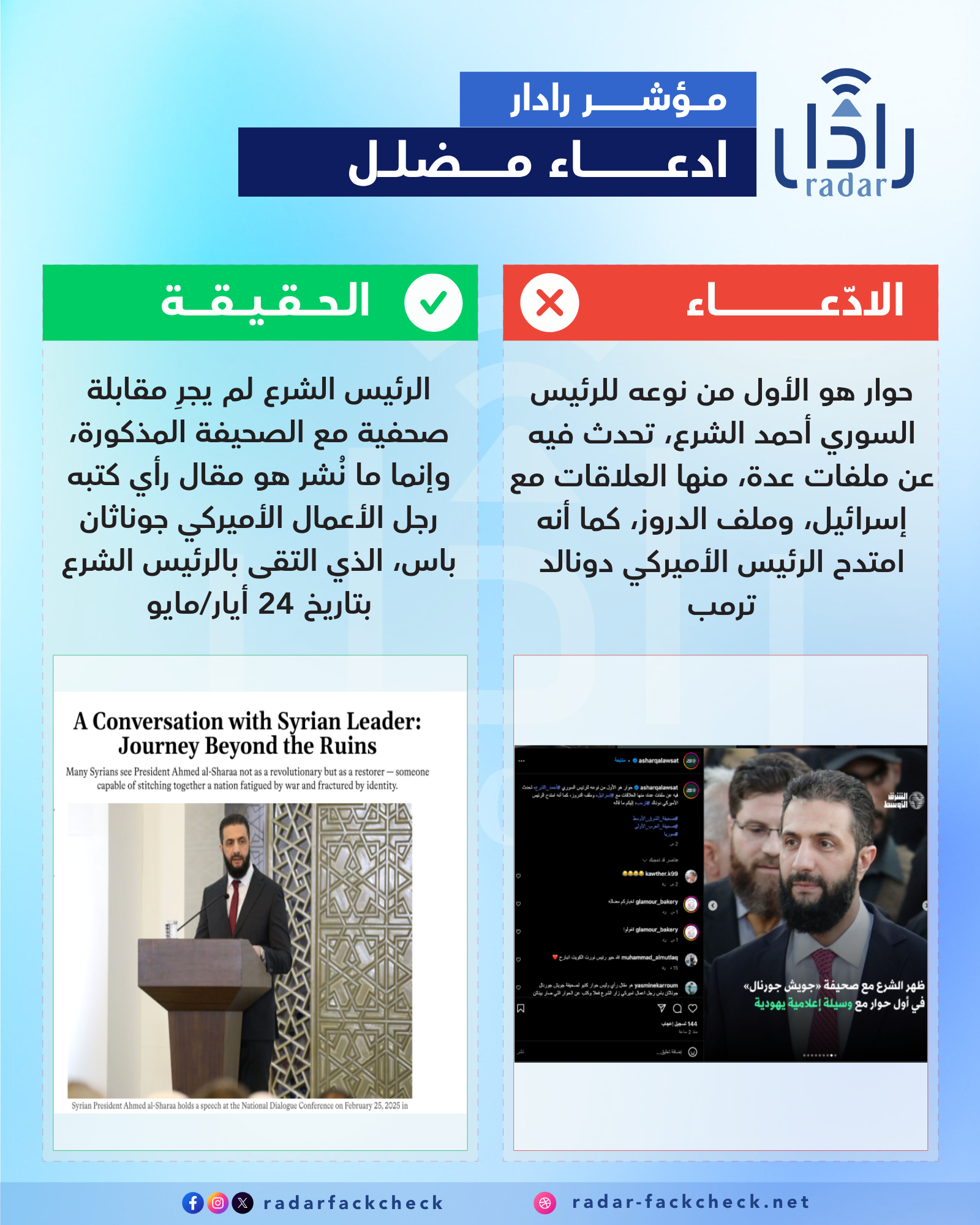 بالبحث في موقع صحيفة "Jewish Journal"، تبيّن أن الرئيس الشرع لم يجرِ مقابلة صحفية مع الصحيفة المذكورة، وإنما ما نُشر هو مقال رأي كتبه رجل الأعمال الأميركي جوناثان باس، الذي التقى بالرئيس الشرع بتاريخ 24 أيار/مايو. وفي مقاله، نقل باس مقتطفات من الحديث الذي دار بينه وبين الرئيس خلال لقاء ودي وغير صحفي، ولم يُجر اللقاء بأي طابع إعلامي رسمي.