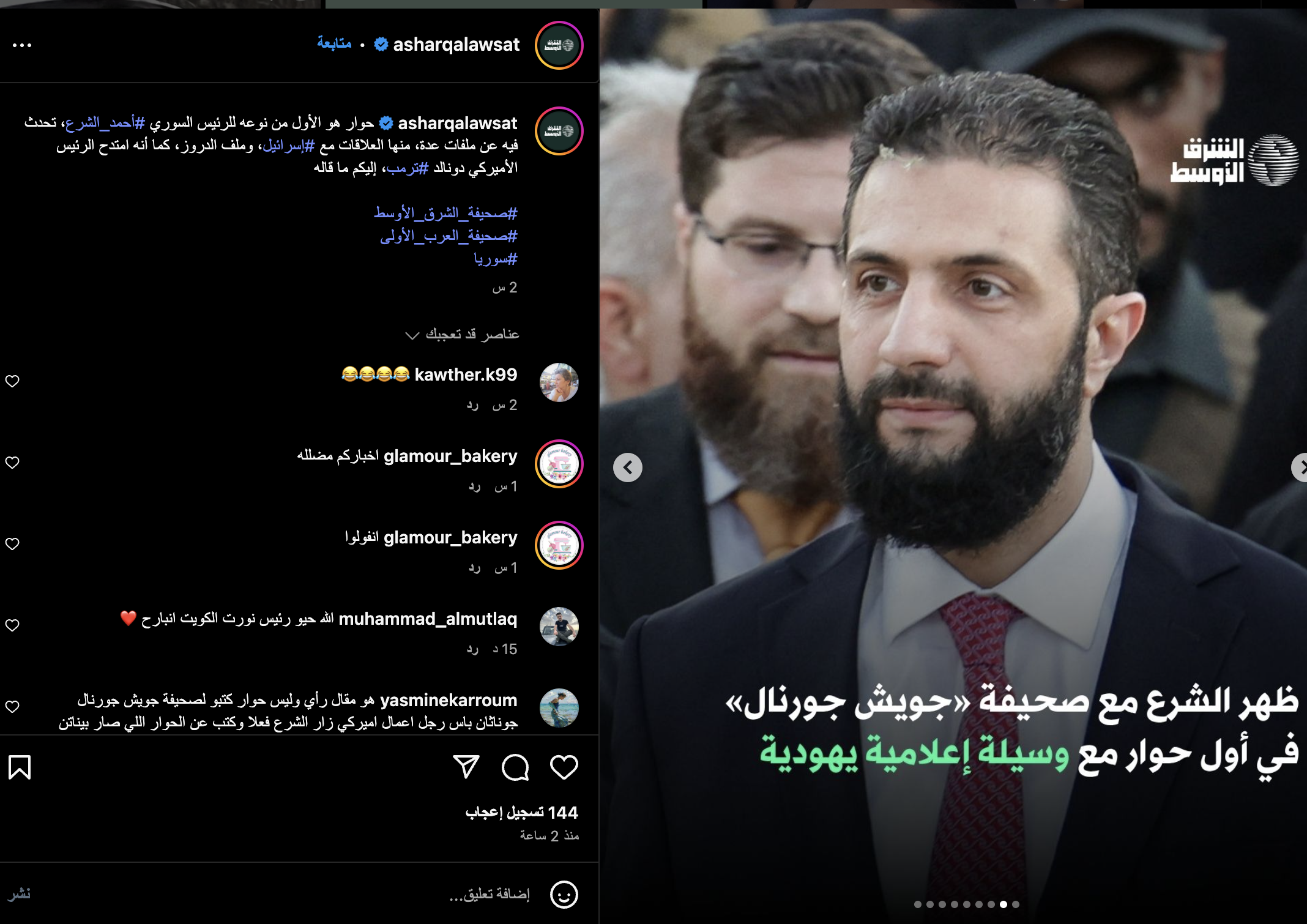 نقلت صحيفة “الشرق الأوسط” أن الرئيس السوري الشرع أجرى حوارًا مع صحيفة “Jewish Journal” الأميركية، ووصفت المنصة اللقاء بأنه الأول من نوعه مع وسيلة إعلام يهودية.