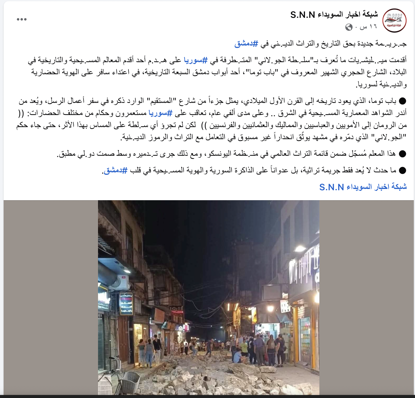 الحكومة السورية قامت بهدم أحد أقدم المعالم المسيحية والتاريخية في البلاد، وتحديداً الشارع الحجري الشهير في منطقة 'باب توما'، أحد أبواب دمشق السبعة التاريخية، ووصفت الأمر بأنه اعتداء على الهوية الحضارية والدينية لسوريا.