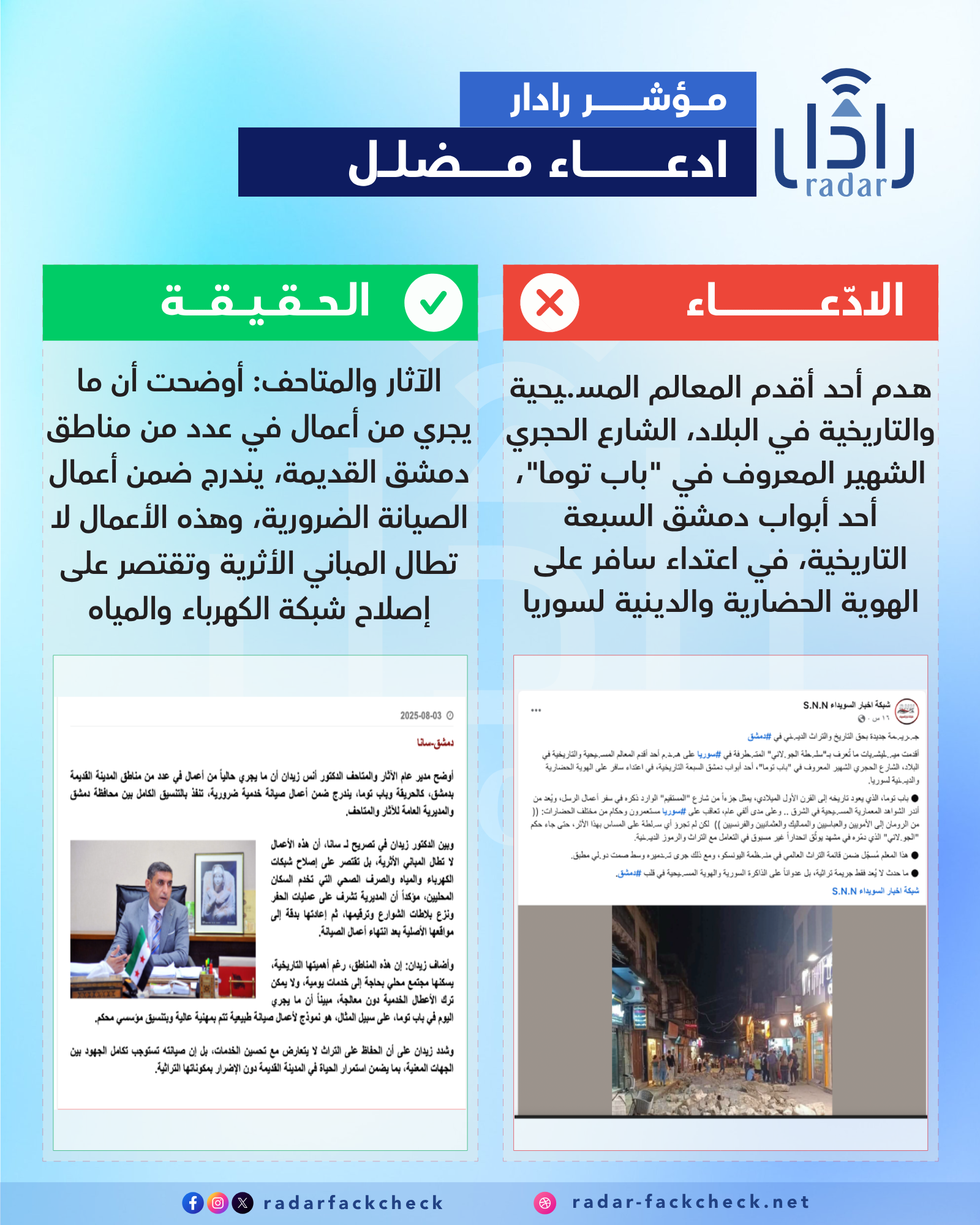 تابع فريق التحقق في منصة 'رادار' الادعاء، ومن خلال البحث في المصادر المفتوحة تبين أن ما يجري في باب توما هو عبارة عن أعمال خدمية تهدف إلى إصلاح شبكات المياه والكهرباء، تُنفذ بتنسيق عالٍ بين الجهات المعنية، وبإشراف على المواقع الأثرية لضمان عدم المساس بها. كما يتم توثيق وترقيم حجارة الشارع الحجري بعناية، لتُعاد إلى أماكنها الأصلية فور الانتهاء من أعمال الصيانة، حفاظاً على الطابع التاريخي والمعماري للمنطقة