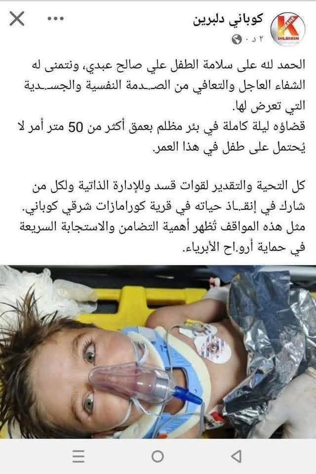 نشرت صفحات موالية لقسد، أن الادارة الذاتية وقسد شاركوا في عملية إنقاذ الطفل “علي عبدي” الذي سقط في البئر يوم أمس، وتم إخراجه صباح اليوم، بعد جهود مكثفة من أهالي المنطقة، وادارة الكوارث السورية والتركية.