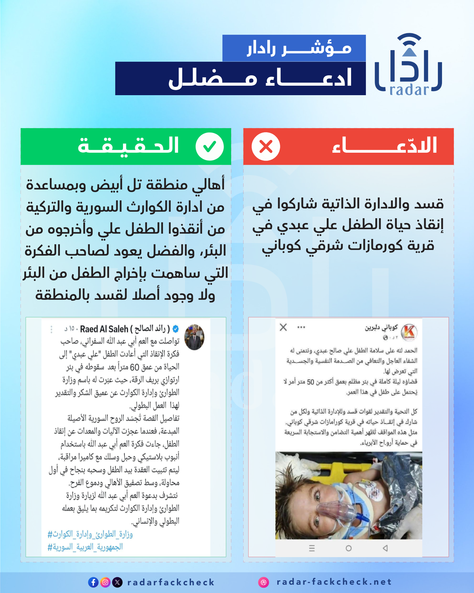 دقق فريق منصة "رادار" صحة الادعاءات المتداولة على عدد من الصفحات الموالية لقسد، ومن خلال البحث في المصادر المفتوحة، تبين أن الطفل علي سقط في بئر ارتوازي في قرية باب الهوى غربي مدينة تل أبيض شمال الرقة، في منطقة تخضع لسيطرة الحكومة السورية، ولا وجود لقسد فيها. والجهات التي شاركت في إنقاذ الطفل هم أهل المنطقة بمشاركة محدودة من فريق من ادارة الكوارث التركية بعدما طلب الوزير رائد الصالح تدخلهم العاجل لانقاذ الطفل، وبعد عجزهم عن إنقاذه وعدم توفر معدات لازمة، اقترح رجل يدعى "أبو عبدالله السفراني" فكرة إدخال حبل داخل أنبوب مزود بكاميرا وربط الطفل بالحبل وسحبه للأعلى، ونجحت هذه الفكرة بإنقاذ الطفل من أول محاولة.