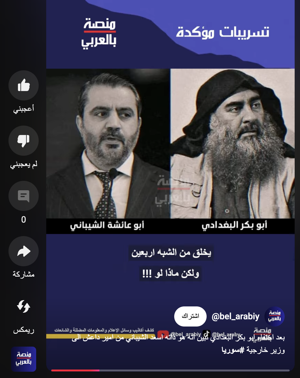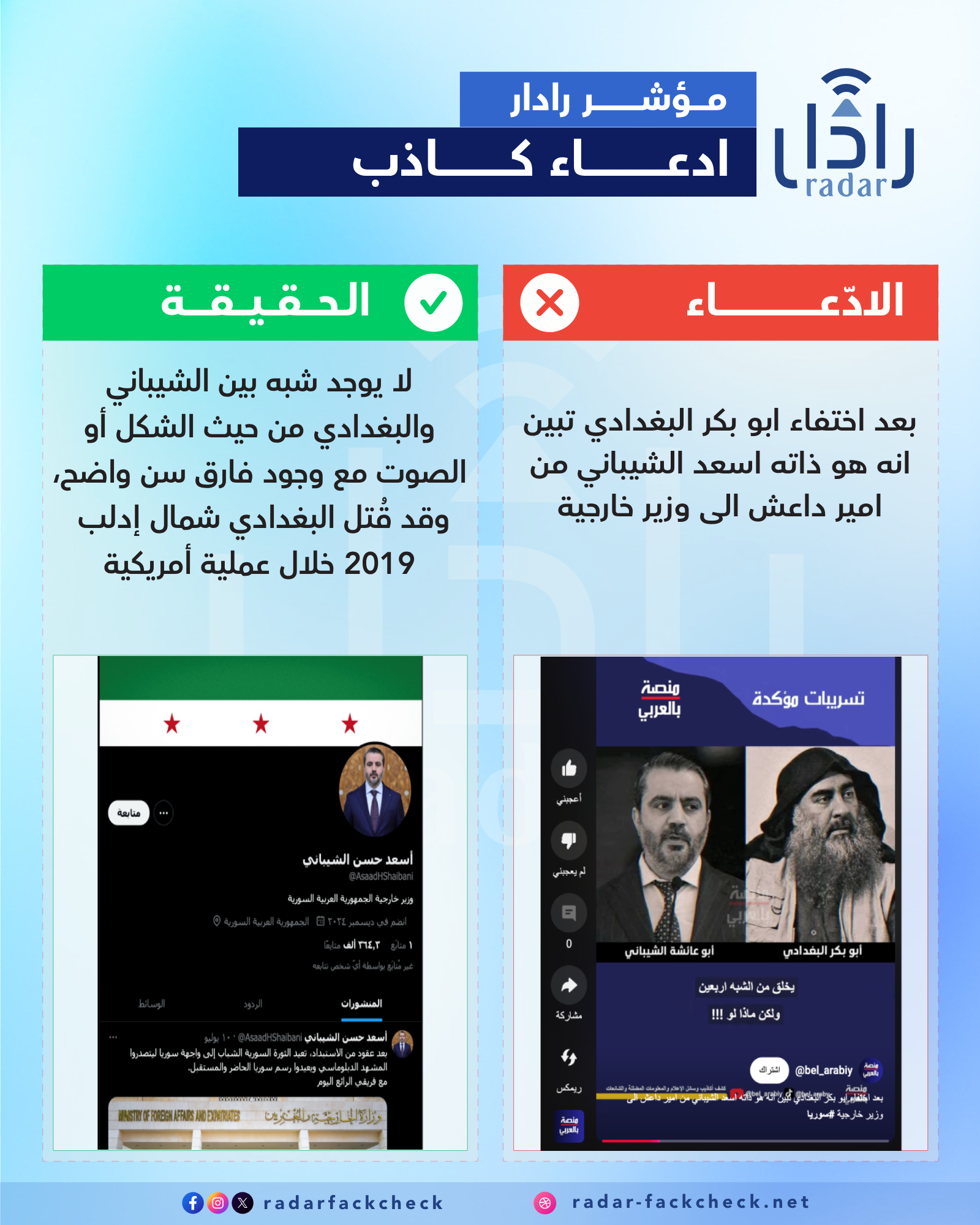 نشرت منصات وحسابات وصفحات على مواقع التواصل الاجتماعي ادعاءاً أن وزير الخارجية السوري أسعد الشيباني هو نفسه أبو بكر البغدادي.